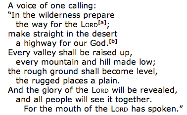 A friend of mine brought this thought to my attention a while back but it wasn’t until recently that God reintroduced it into my life and I began thinking, meditating, and chewing on Isaiah’s words in chapter 40, especially verses 3-5 [click here for the whole chapter]: